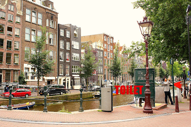 While having a leisurely stroll along the streets paved with worn red bricks, admiring all those beautiful crooked buildings, a nasty foul odor wafted by. It turns out that funky smell came from street toilets (only for men) that you can use for free. That green cylindrical cover standing behind the lamp post is actually a street toilet. What do you know? There are free toilets after all, just not for the women!