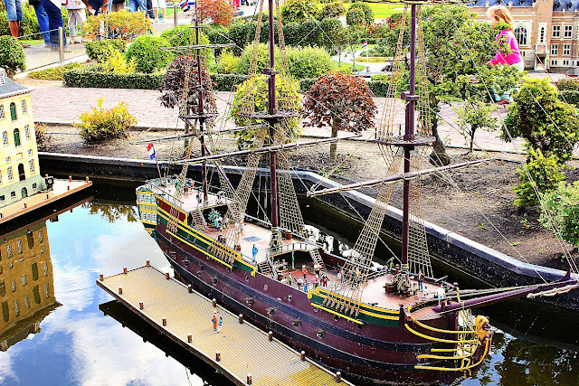 | miniature Royal Palace with Magna Plaza on the right and the National Monument at Madurodam |