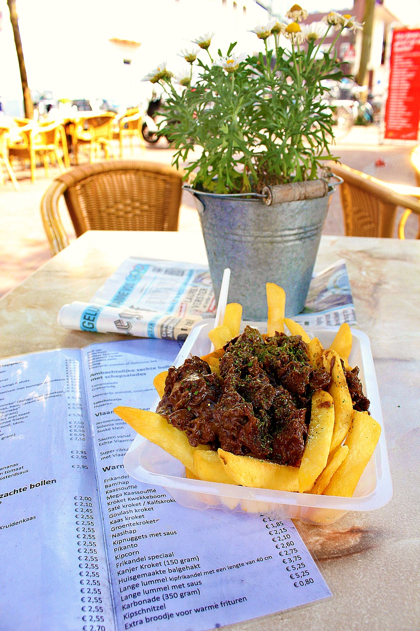 French fries (or 'Patat' in Dutch) are cut thick, made fresh and fried perfectly with a nice crisp on the outside, tender and moist inside, served with mayonnaise or pindasaus (peanut sauce) and eaten with a small fork. Sometimes, it's also served with a nice stew called Stoofvlees.