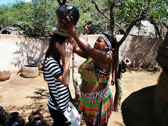 trying my luck to balance a clay pot on my head (and concentrating real hard not to drop it - "don't drop it..don't drop it..don't drop it"). I tell you, this takes a lot of skill and practice unless you have a head shaped like the Table Mountain in Cape Town. This is how the Zulu women carry pots with water, way bigger and heavier than this.